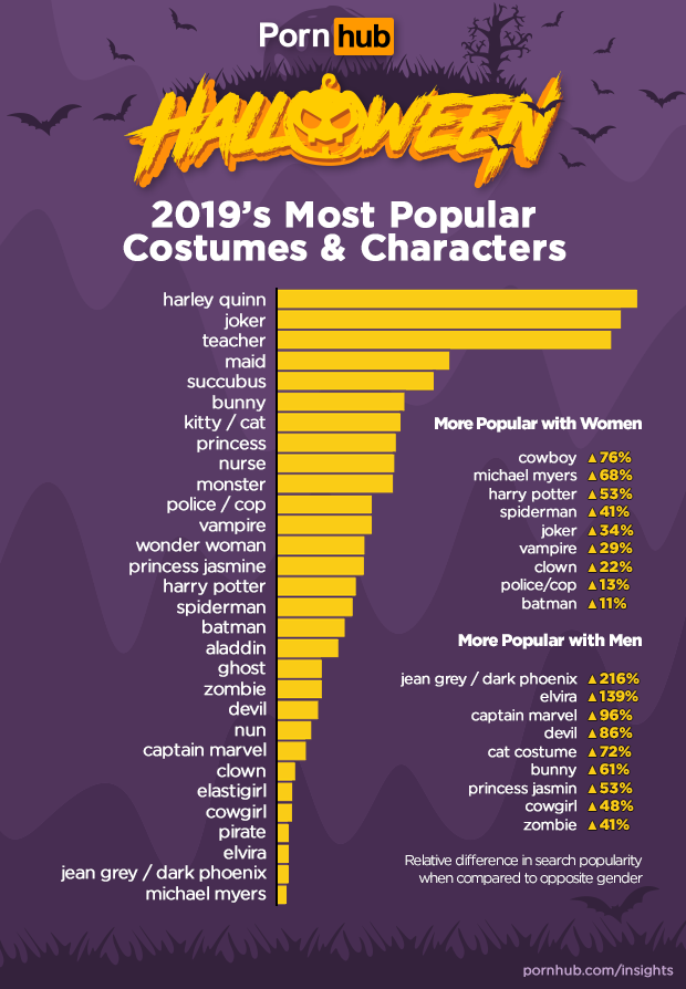 If you’re looking to dress up to attract the opposite sex (or the same sex as your case may be), our statisticians took a closer look at what costumes men or women prefer to search for. In the case of female visitors, they’re 76% more likely to search for “cowboy” (when compared to men), 68% more into “Michael Myers”, 53% more into “Harry Potter” and 34% more into the “Joker”.