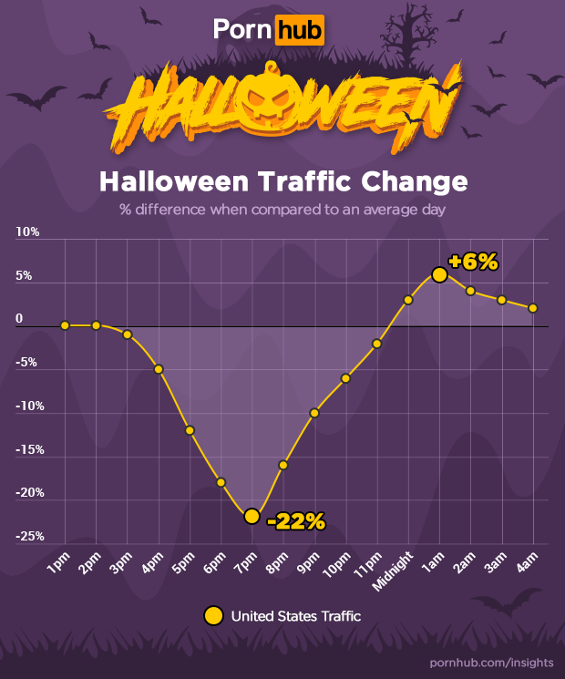 Finally, our statisticians looked at how traffic to Pornhub was affected on October 31st. Adjusted for time-zones, traffic across the United states dipped by as much as -22% at 7pm then grew to +6% above the daily average at 1am as people returned home and began to strip off their costumes.