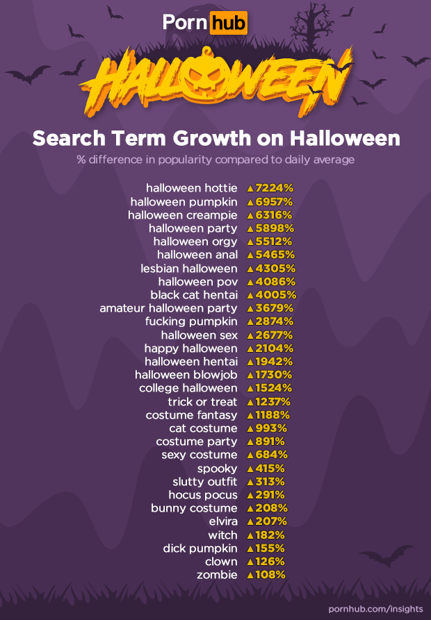 To see what searches had the biggest increases on Halloween Day, our statisticians turned back the clock. Last October 31st, “Halloween hottie” increased by 7224%, “Halloween pumpkin” by 6957% and “Halloween creampie” by 6316%. Porn searches related to Halloween parties, orgies (NSFW), sex, costumes and fantasies were all up on Halloween.