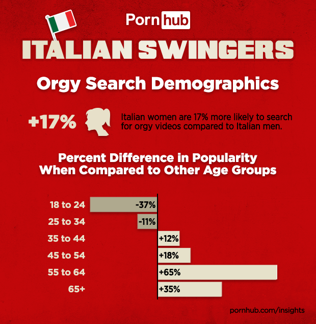 It seems that Italian Millennials aged 18 to 34 are less likely to view orgy related videos compared to Italian visitors over the age of 35. Visitors in the 55 to 64 age group are the most interested, with relative popularity being 65% higher than all other age groups.