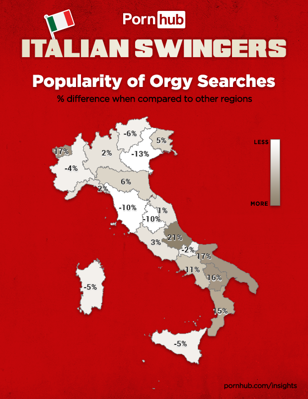 Lombardia, Liguria e Marche sono vicine della media (+ 2%, + 2% e + 1%), mentre le isole italiane, Sardegna e Sicilia, non sono molto interessate all’argomento e registrano entrambe un -5%. La regione in cui l’interesse per le orge è il più basso dell’intero paese è il Veneto, con il -13%.