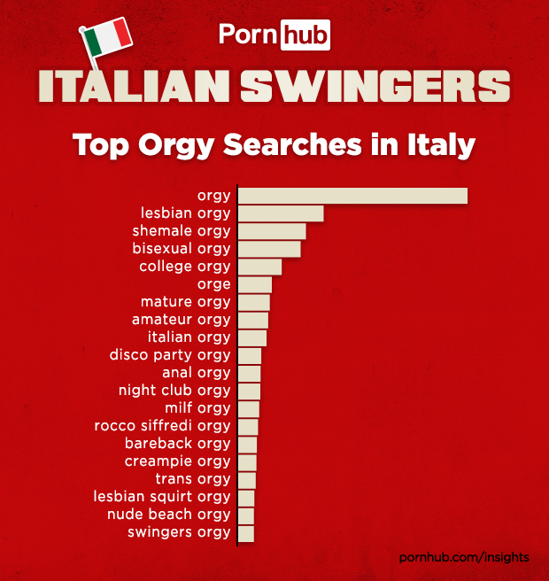 Next up, please join us for some orgy action. “Orgy” is the most popular search in Italy, followed by variations like “lesbian orgy”, “shemale orgy”, “anal orgy” and “mature orgy”. These results are in accordance with our last Year in Review where we found that “Lesbian”, “Anal”, “Mature” and “Transgender” were in the Top 5 relative categories in Italy.