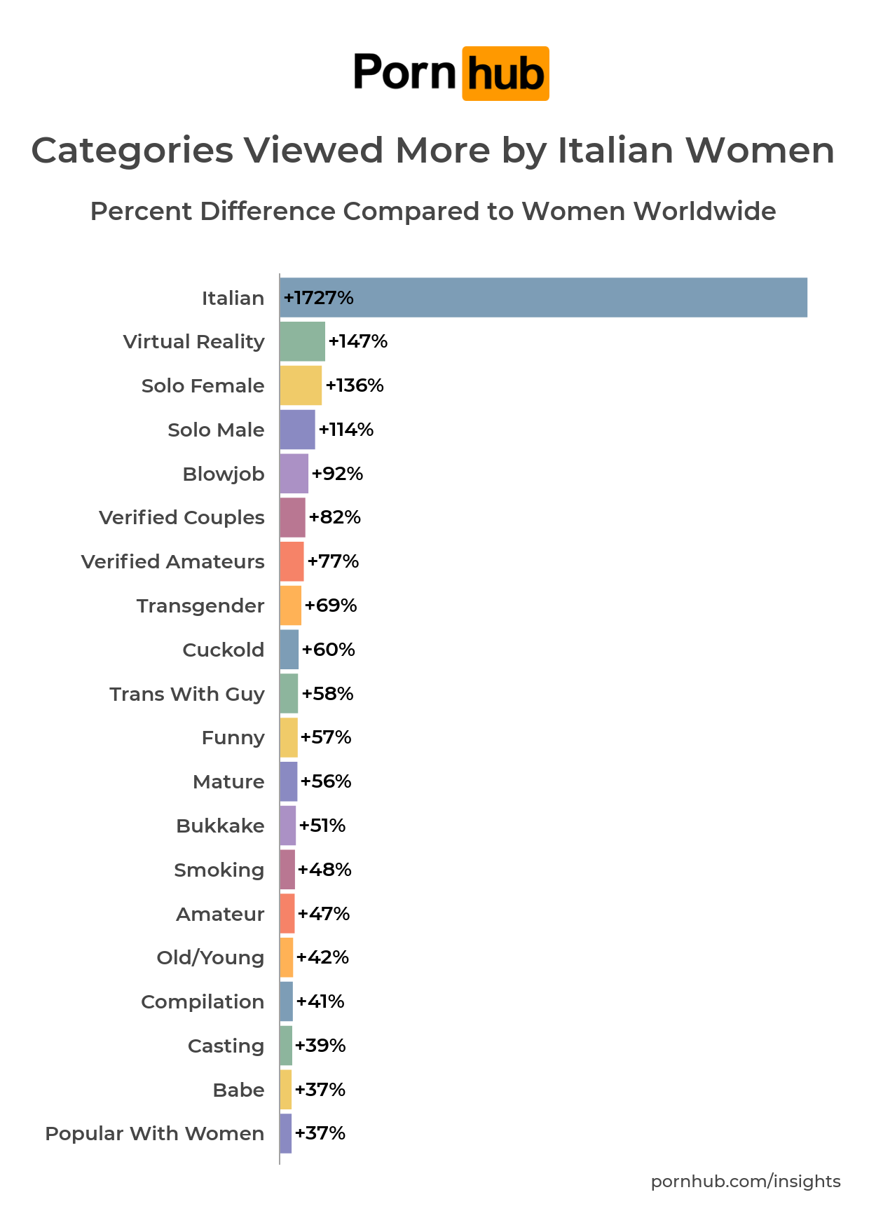 After that obvious first place, we find something we didn’t expect: “Virtual reality”, that is +147% more likely to be seen by Italian Women. Looks like Italian women like to use technology to plunge deep in hot scenes.