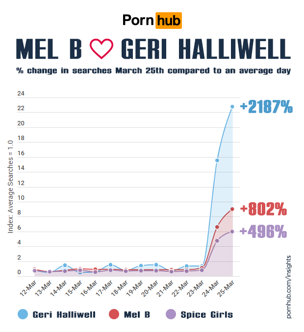 If you’ve been following the Pornhub Insights blog, you already know that Lesbian (NSFW) is the most viewed category of video, so we weren’t surprised when searches for Mel B, Geri Halliwell and even ‘Spice Girls’ all saw massive increases over the last 48 hours.