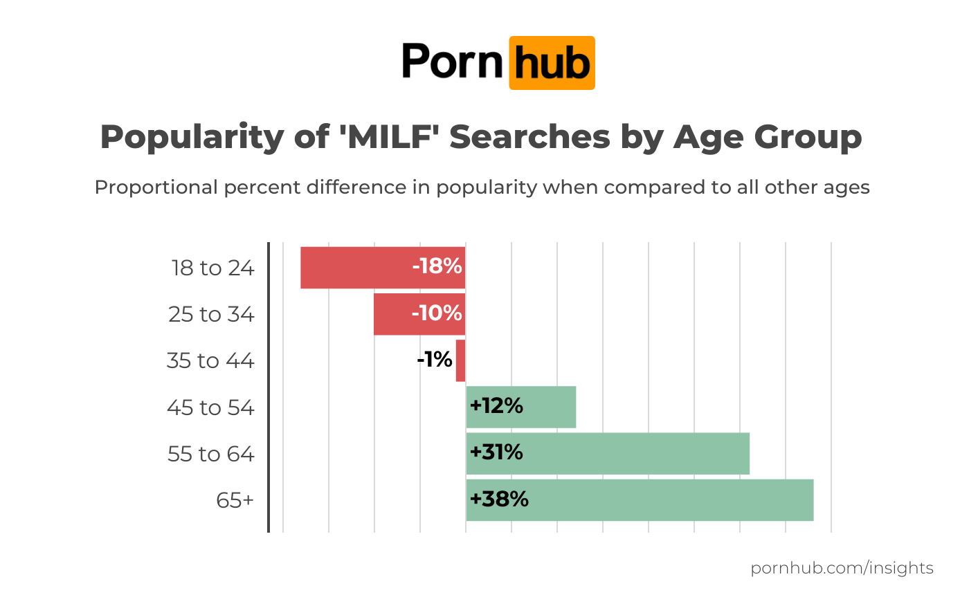 What about age, you might be wondering? Our data team looked into that as well! We found older demographics were more likely to search MILF porn. The age group of 18-24 searched MILF porn –18% compared to their older counterparts. The age group of 65+ searched MILF porn +38% more.