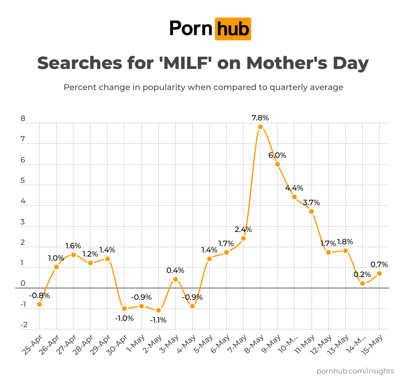 That being said, we looked at the popularity of the term MILF on Mother’s Day compared to average and saw an increase of 7.8%. While this may not seem like much of a rise, keep in mind it is one of the top searches year-round. An increase of nearly 8% means it takes an extra hundreds of thousands of searches to make that much of a splash!