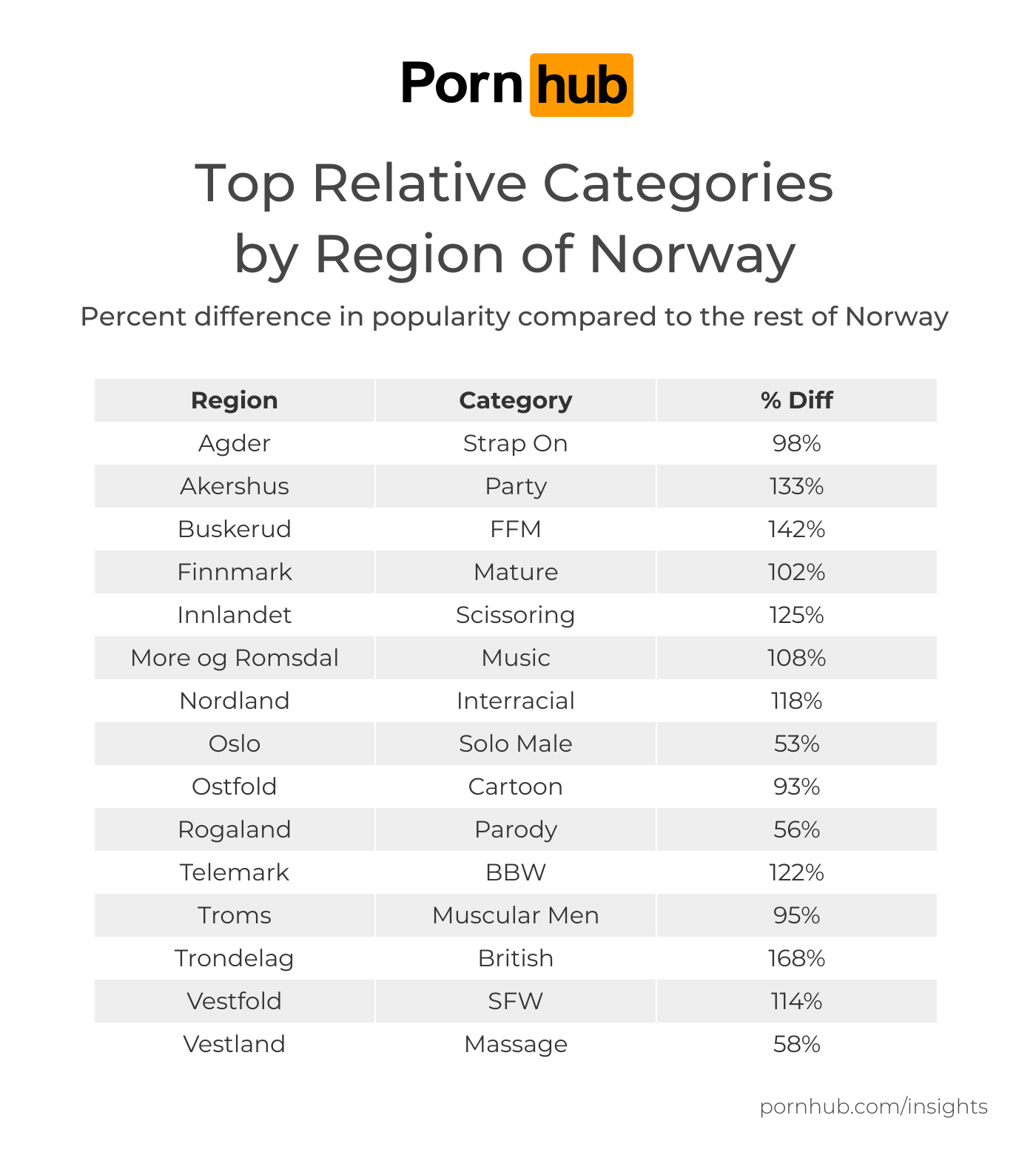 Looking at the difference in terms by region broke down Norwegian interests even further. In Troms, “red hair blowjob” saw a 1,536% difference. In Finnmark, “facesitting” saw a 1,302% difference. Nordland liked “sexy dress” at a 1,216% difference. And Telemark enjoyed “boat sex” at a 1,024% difference.