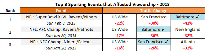 When big games were on TV, there were massive drops in the cities playing in the games, not to mention a country-wide drop exemplifying the NFL’s popularity among Pornhub users.