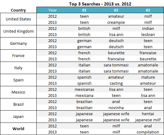 Apart from many countries being nationally proud when it comes to their porn-viewing selections, the world-wide top searches stood strong from 2012-2013 with “teen” and “milf” being the top 2 searches, while “compilation” took over for “anal” in the 3-spot.