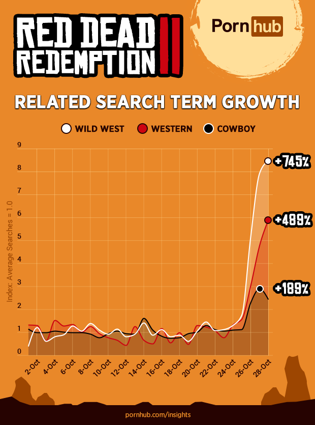 Our statisticians found that searches containing “red dead” began to increase on Pornhub several days before the October 26th release, as the final launch trailer and game details hit the internet. Searches continued to grow following the launch, reaching 731% above average on October 28th.