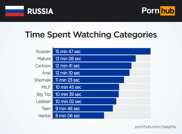 The time spent viewing different categories can also vary greatly. For example, Russians will often spend 16 minutes browsing and watching videos in the “Russian” category, but only 8 minutes in the “Hentai” category.
