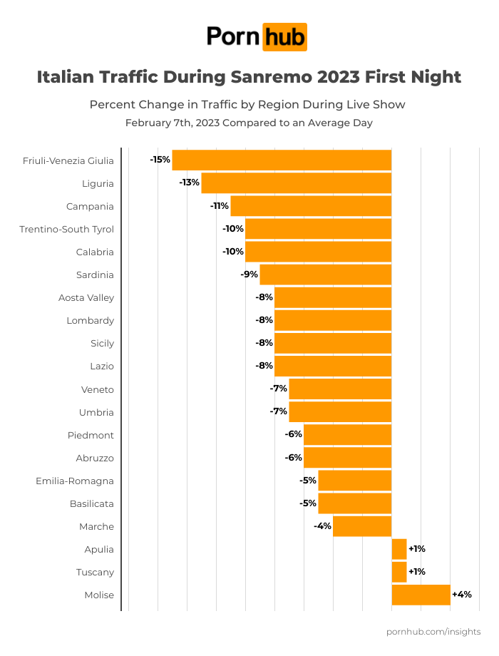 Si registra poi il maggior calo del traffico su Pornhub, -17%, alle ore 23:00, durante l’esibizione dei super ospiti della serata, i Pooh. Nello stesso momento, in Liguria il traffico tocca il -20%.