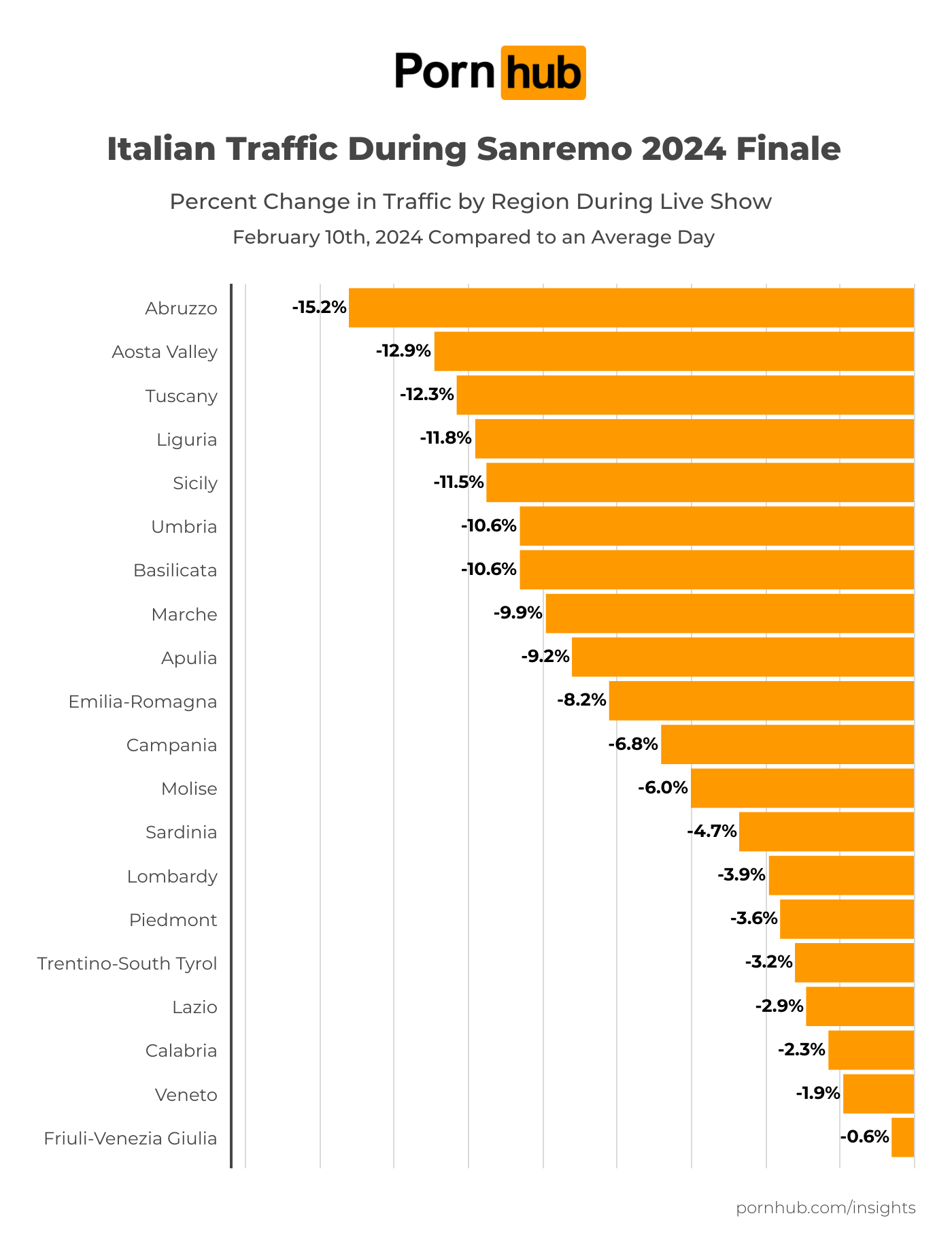 After they announced the winner of the festival on the night of February 10, traffic to Pornhub soared. In Italy, traffic jumped +26.9%. In Liguria, traffic almost doubled that, with a +41.7% increase. It seems people couldn’t wait until the show was over so they could rush back to their favorite black and orange website. Interestingly, this year’s winning song was “La Noia” which translates to “boredom” in English, sung by Angelina Mango.