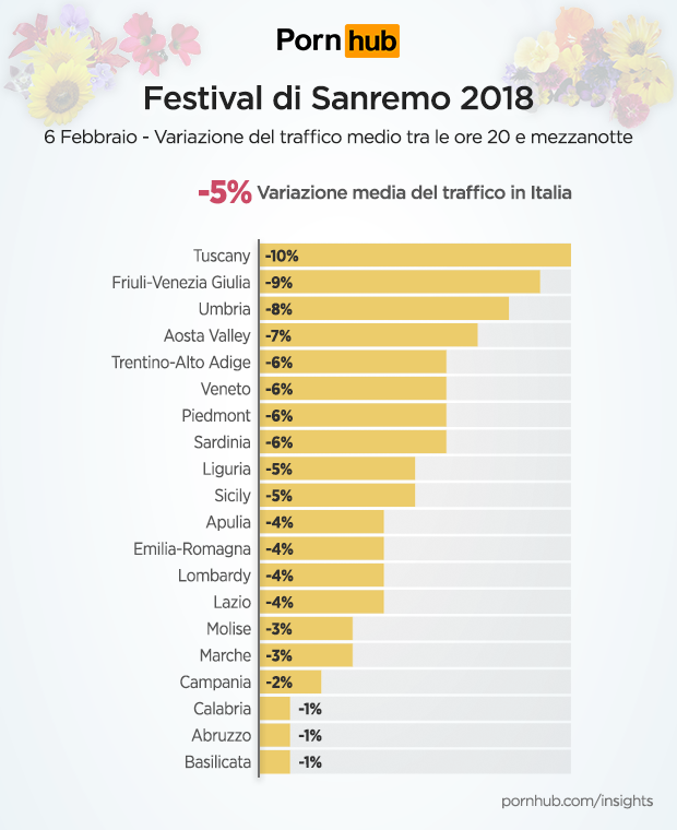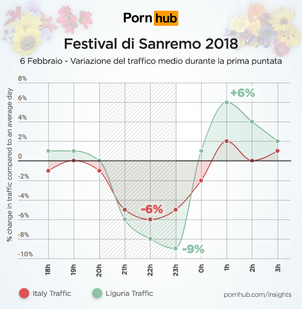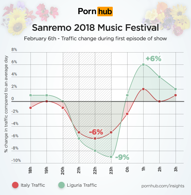 Si registra poi il maggior calo del traffico (6%) su Pornhub alle ore 22:00, momento in cui Claudio Baglioni e Fiorello hanno tenuto tutta l’Italia alla larga dal porno cantanto insieme “E tu”.