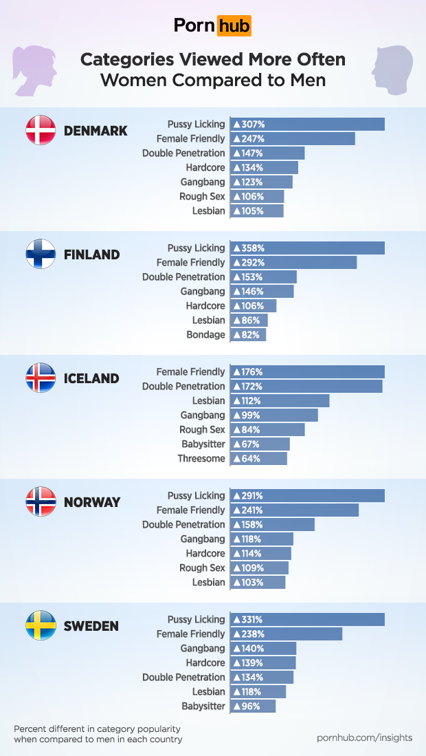 27% of Pornhub’s visitors from Sweden, Norway and Iceland are women — matching the worldwide average. In Finland, 26% are female, and Denmark 25%.