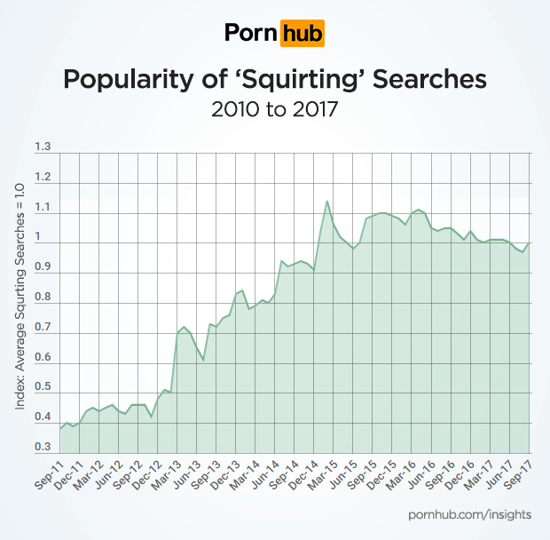 Squirting is a term used to describe female ejaculation, and it’s popular category and search on Pornhub. The popularity of squirting videos (nsfw) increased drastically between 2013 and 2015, and has remained as one of Pornhub’s Top 20 categories of videos. Our friends at Clued In asked Pornhub’s statisticians to strap on their goggles and take a close up look at squirting.