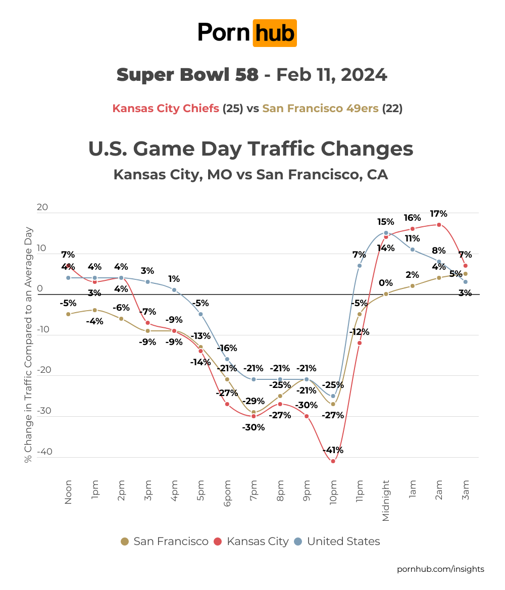 After the game, folks from Kansas City celebrated their win with a big increase in Pornhub viewership by as much as +17% after midnight and continuing in the early morning. On the other hand, San Francisco accepted their loss and headed right to bed, with traffic after midnight being typical for a Sunday night.
