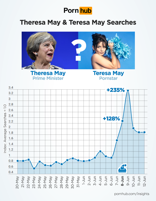 The election clearly had an effect on when people were watching Pornhub that day, but how about what they were searching for? Just as we found with Trump Related Searches during the U.S. Election, people were indeed searching Pornhub for their leading lady. Or were they? Turns out there is a pornstar named “Teresa” May, so it’s hard to say if people were seeking her or the “Theresa” P.M. Either way, searches containing either Theresa May or Teresa May were up 128% on June 8, and 235% on June 9.